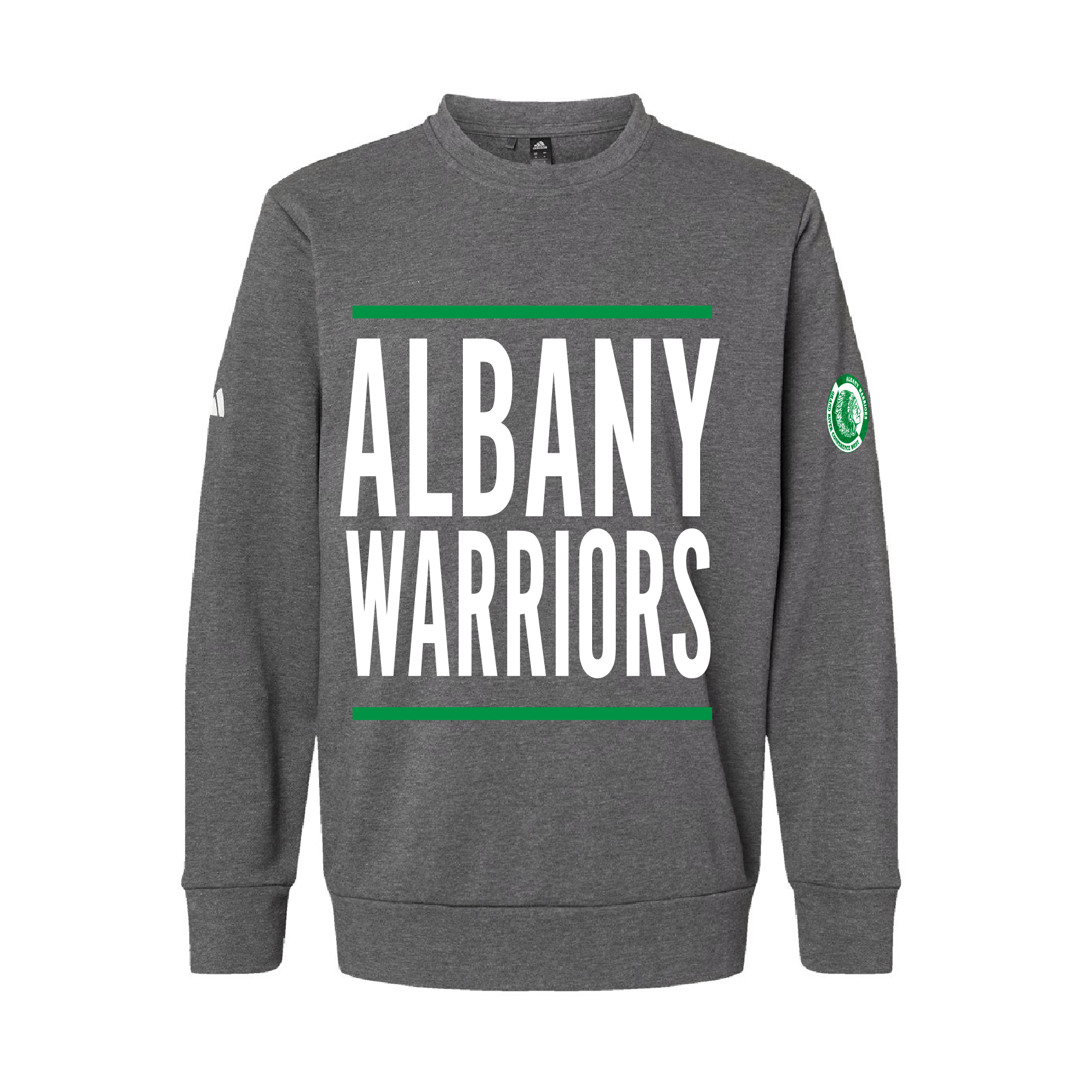 Declare your Warrior spirit boldly with the BIG WARRIOR Adidas crew neck sweatshirt! This standout shirt fuses athletic flair with unbeatable comfort, making it essential for rallying behind the Albany Warriors. The signature short sleeves deliver an edgy update, while the fierce design ensures you dominate the sidelines. Own your look, own the game, and back your Warriors with fearless style!