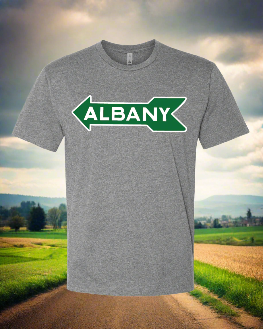 The shirt features a stunning graphic of the Albany welcome arrow, encapsulating the beauty of rural landscapes and the joy of returning home. The rustic, hand-drawn style infuses authenticity and warmth into every wear.