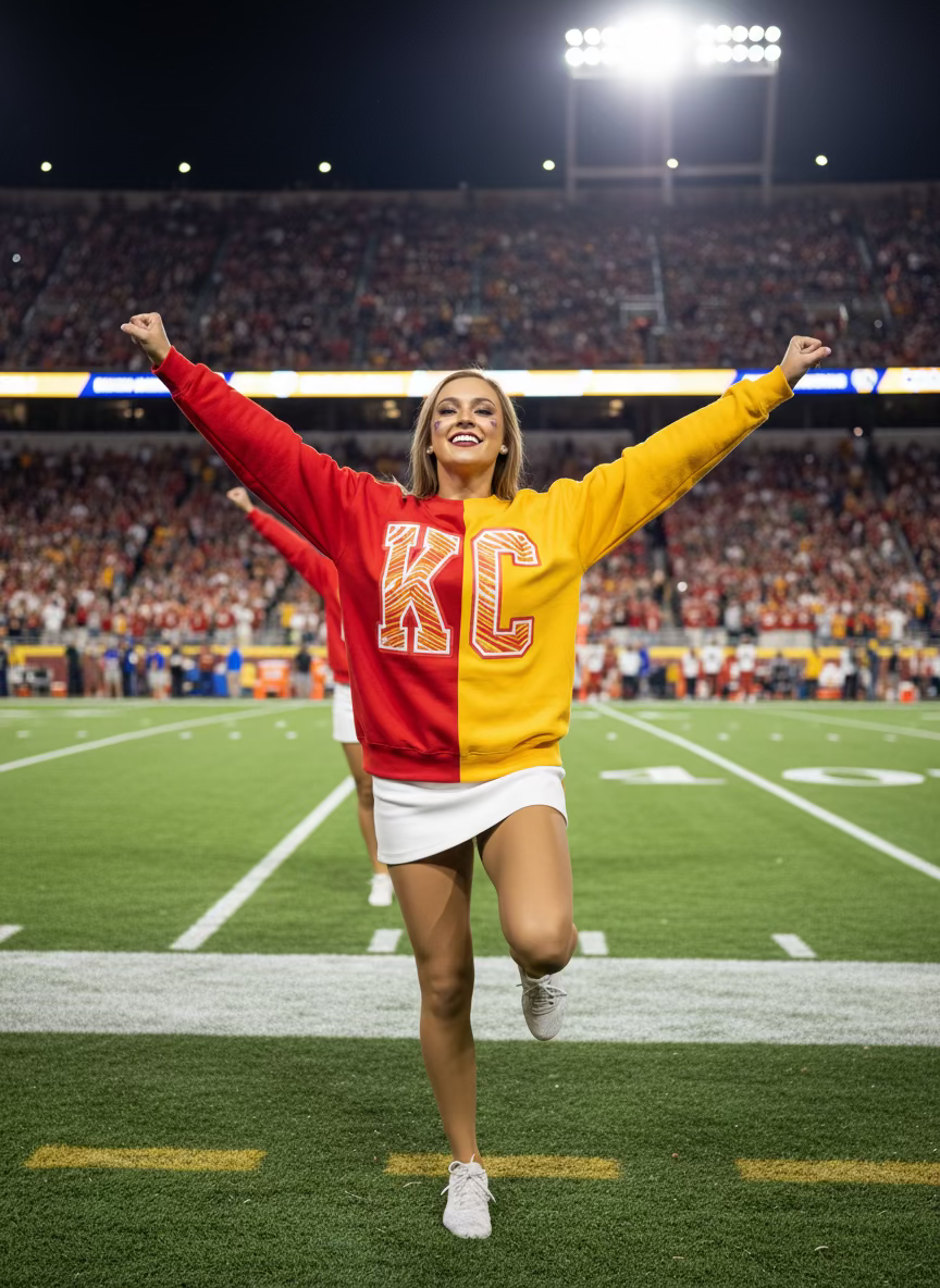 Bring the fun to football season with this vibrant Red & Gold Split Colored Crewneck Sweatshirt, complete with eye-catching KC Zubaz print that's impossible to ignore. Why choose between comfort and style when you can have both? This two-toned beauty keeps you snug while turning heads with its bold, playful design. Crafted by hand—cut and sewn with care—each sweatshirt is a one-of-a-kind creation, so yours will be as unique as you are. Whether you're cheering on your team or just living your best casual life, this sweatshirt lets your personality shine through with a wink and a grin. Stand out, have fun, and wear your spirit with pride.